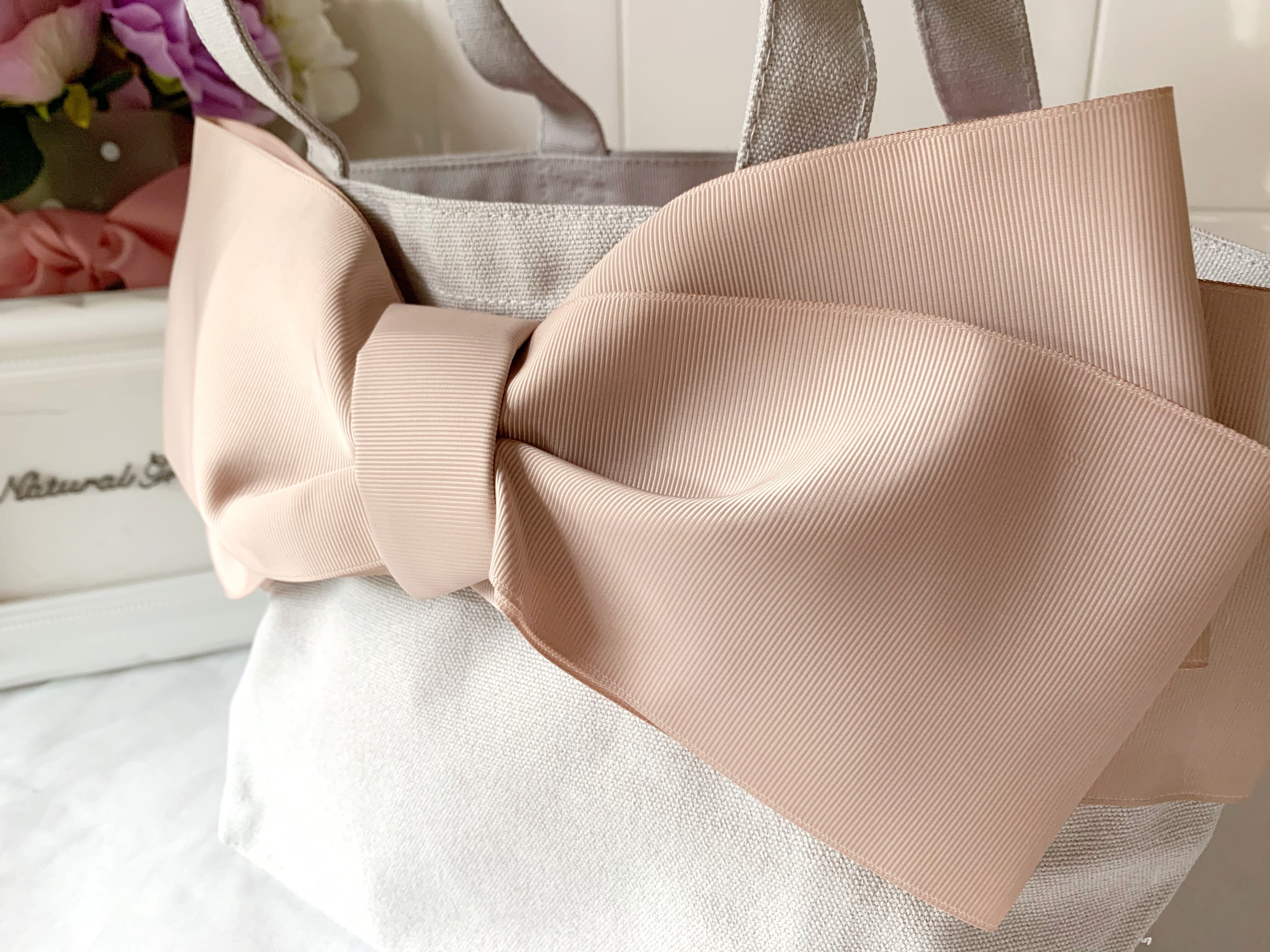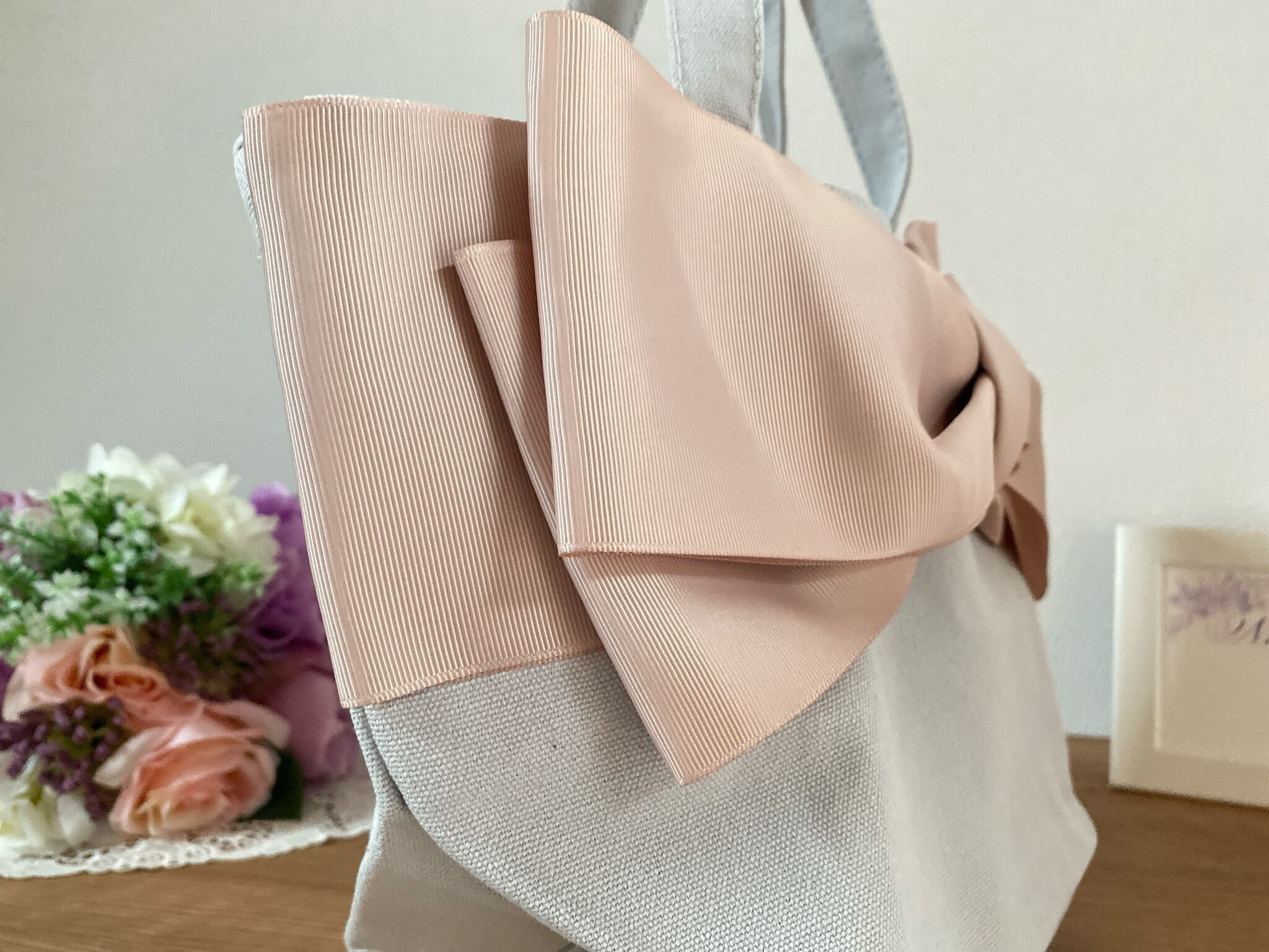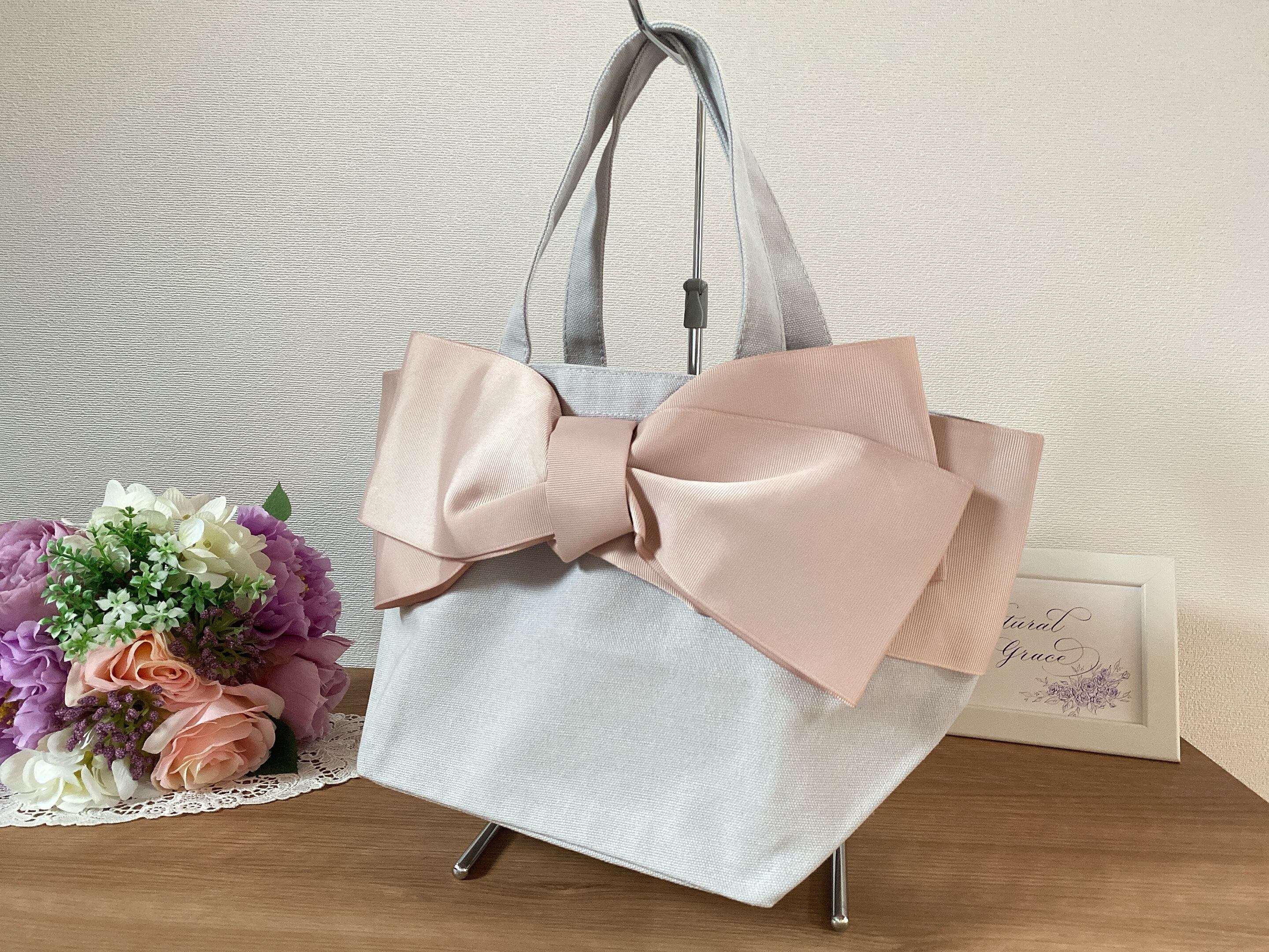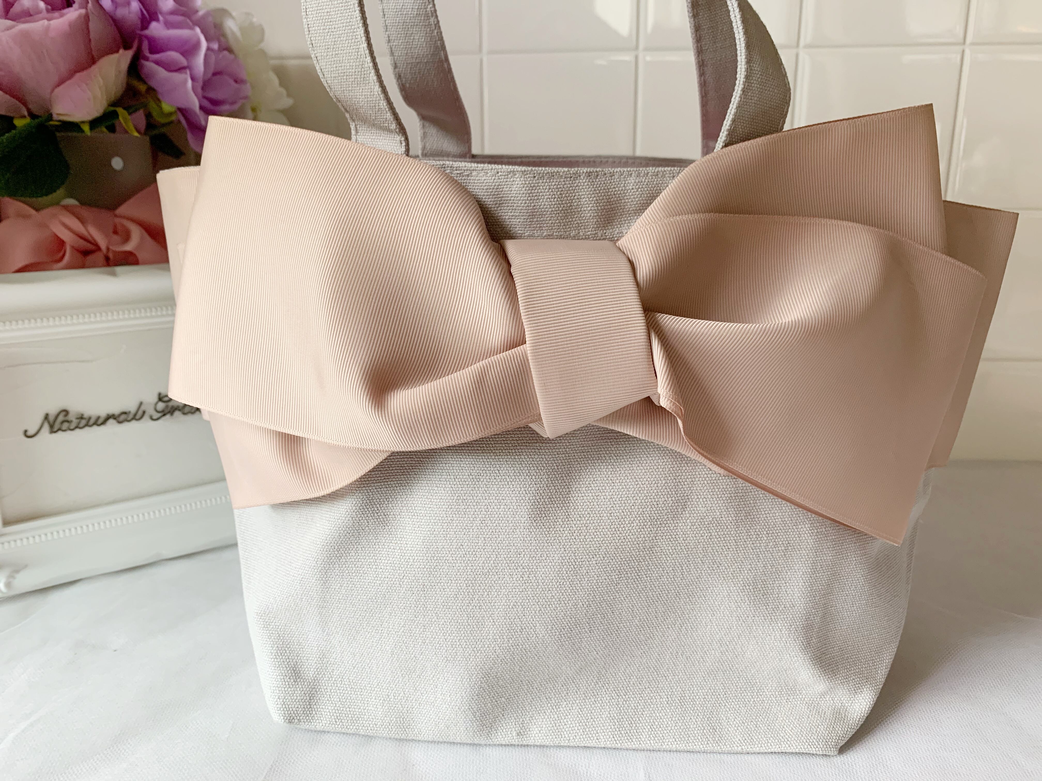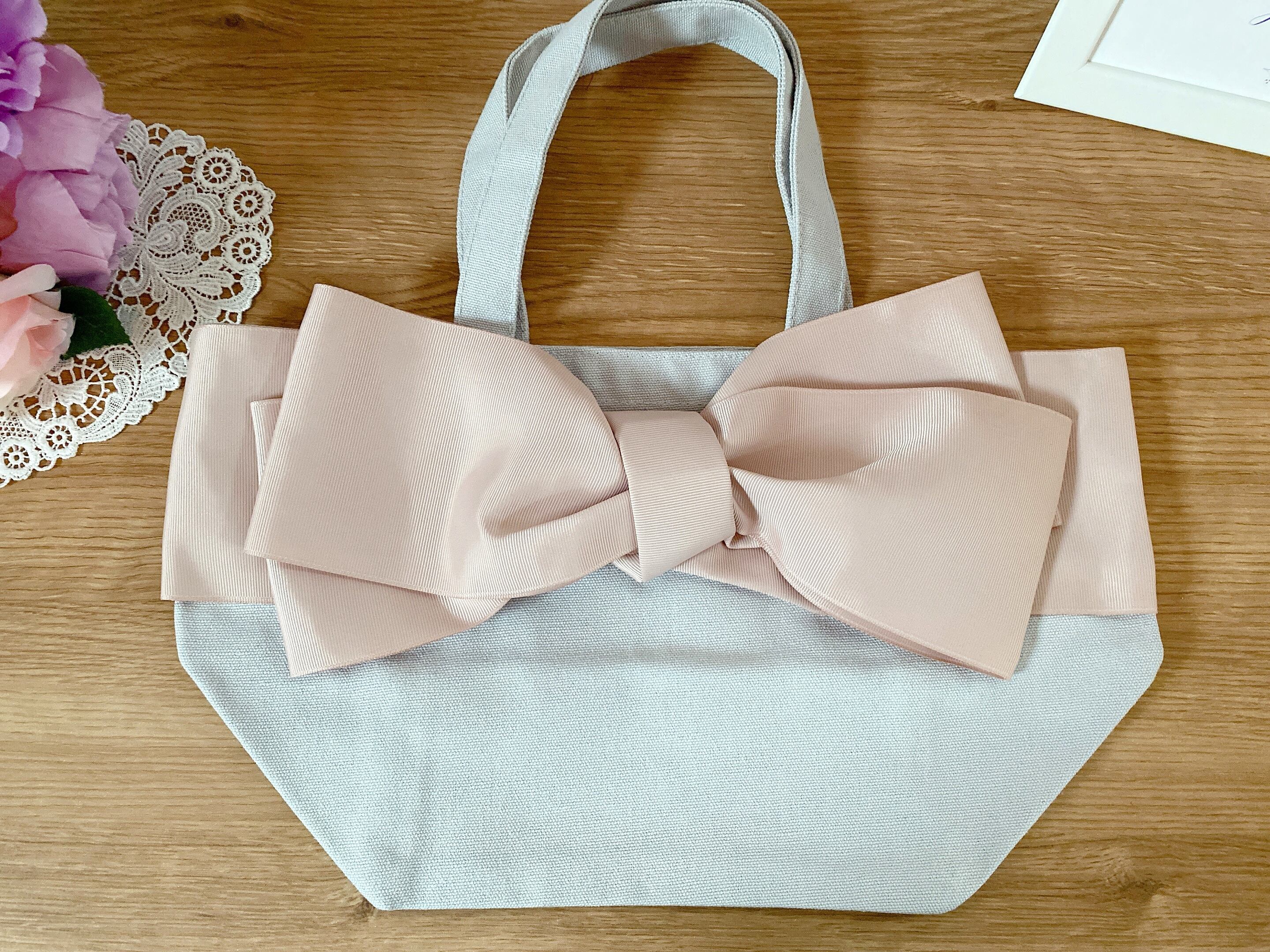 大人キュートなリボンバッグ《candybag 》グレー×バニラ(くすみピンク)